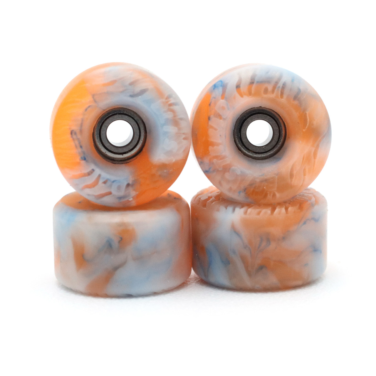 Blistered Wheels are hand made with proprietary processes developed by us using special materials, pigments, and high tech equipment to create the best urethane fingerboard wheels. Urethane is the same material real skateboard wheels are made of, giving a very realistic feel. Our blend is tailored for the best fingerboarding experience, to ensure that the wheels have just the right balance of grip and hardness to make them really special.